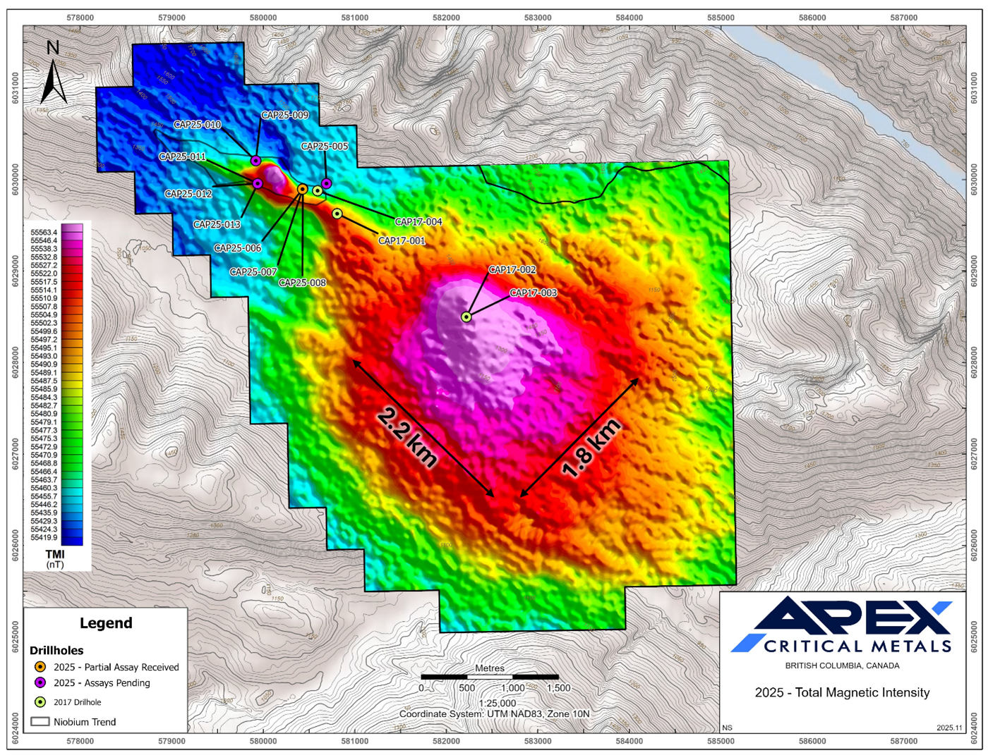 Vancouver, British Columbia – November 12, 2025 – Apex Critical Metals Corp. (CSE: APXC | OTCQX: APXCF | FWB: KL9) (“Apex” or the “Company”), a Canadian mineral exploration company focused on the identification and development of critical and strategic metals, is pleased to announce the completion and results from a high resolution airborne geophysical survey completed at the Company’s 100%-owned Cap Critical Minerals Project (“Cap” or the “Cap Project”) in central British Columbia.