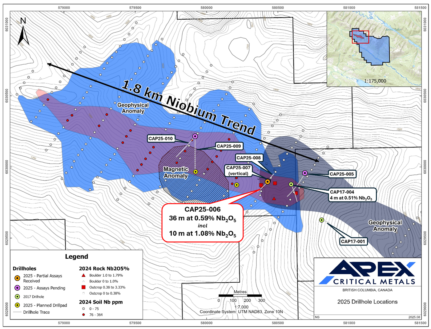 Vancouver, British Columbia – August 27, 2025 – Apex Critical Metals Corp. (CSE: APXC | OTCQX: APXCF | FWB: KL9) (“Apex” or the “Company”), a Canadian mineral exploration company focused on strategic critical metals, is pleased to announce a major niobium discovery in its second hole from its 2025 diamond drill program at its 100%-owned Cap Critical Minerals Project (“Cap” or the “Cap Project”) in central British Columbia.