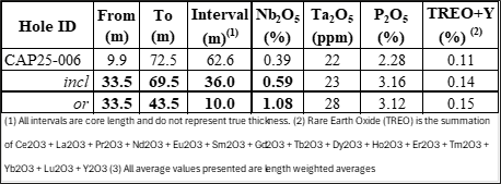 Preliminary visual results from drillhole CAP25-006 of the 2025 campaign motivated the Company to request a rush order for the results from the upper 72.5 metres (“m”) from the assay lab. The results confirm strong niobium mineralization starting at 33.5 m downhole with 36 m at 0.59% Nb₂O₅, including a higher-grade zone of 10 m averaging 1.08% Nb₂O₅ (see Table 1, Figure 1). These results validate the strong visual estimates of pyrochlore mineralization (Figure 2) reported in the Company’s August 12 news release and demonstrate the grade potential over significant thickness at depth, where the heart of the mineralized system remains untested.