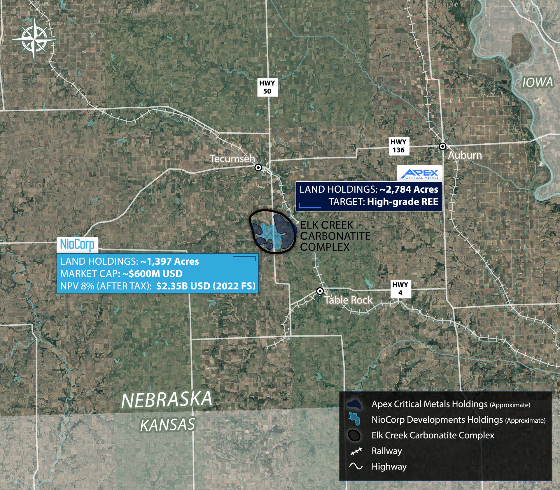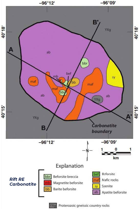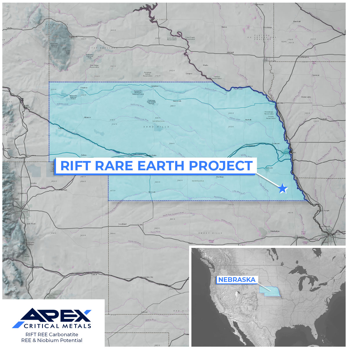 The Rift REE Project is a globally significant rare earth and niobium project located in southeastern Nebraska, USA, at the highly prospective Elk Creek Carbonatite Complex near the village of Elk Creek. With a diameter of 6–8 km, it ranks among the largest carbonatite bodies in the world. The project is positioned within a Tier-1 jurisdiction, offering excellent infrastructure and geopolitical stability.