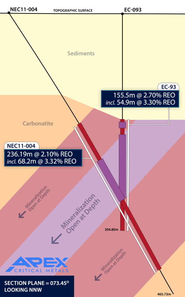 Two target areas (East Zone and West Zone) include multiple historical drill holes that are well-mineralized in REE’s.